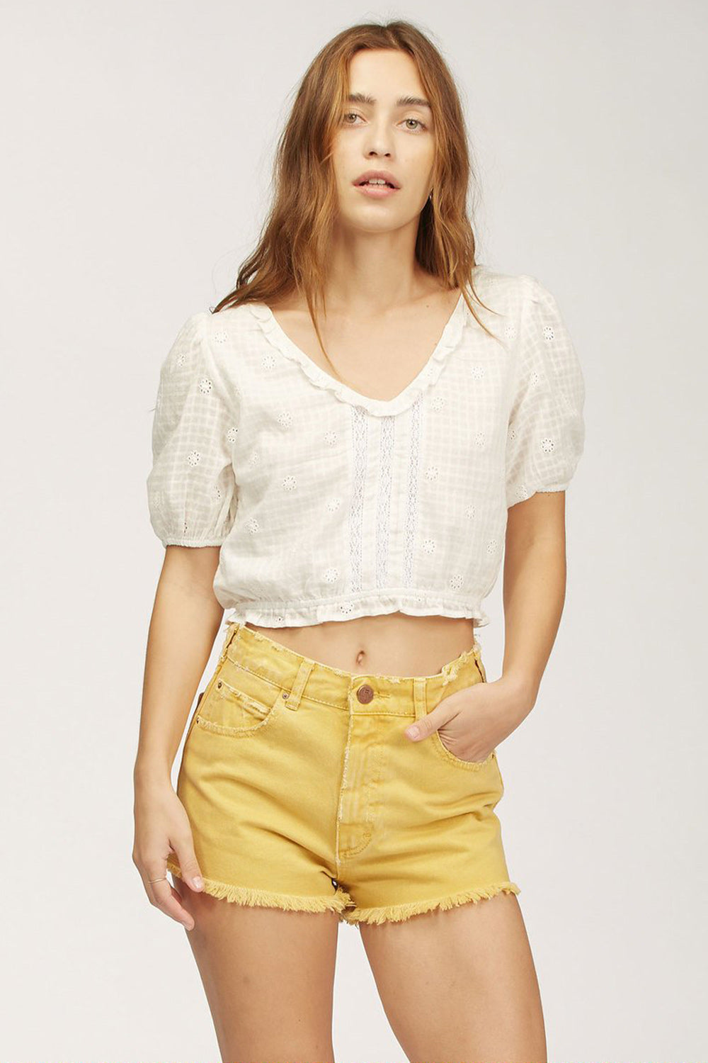 Hello, sweet thing. The Simply Sweet crop top has arrived to make your country-chic boho dreams come true. An essential for the ones who roam wild and run free, this little heartbreaker is all dolled up with puff sleeves, ruffles at the neckline, and lace trim detailing. And you know what's extra dreamy? We made this top with Eco-Conscious Cotton eyelet. Our Eco-Conscious cotton is farmed and produced in a way that aims to reduce its environmental impact and improve working conditions.