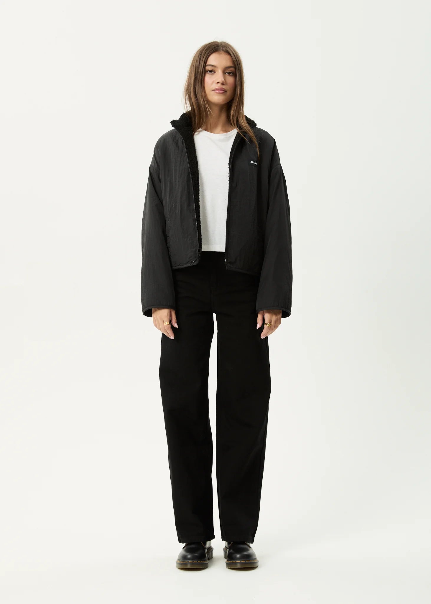 This fully reversible jacket is designed for cozy warmth and comfort, crafted from 100% recycled materials. Slightly cropped, wider silhouette with patch pockets on the polar fleece side, and welt pockets on the taslon side. Wear it fleece side in for warmth or reverse to the taslon side for water resistance.